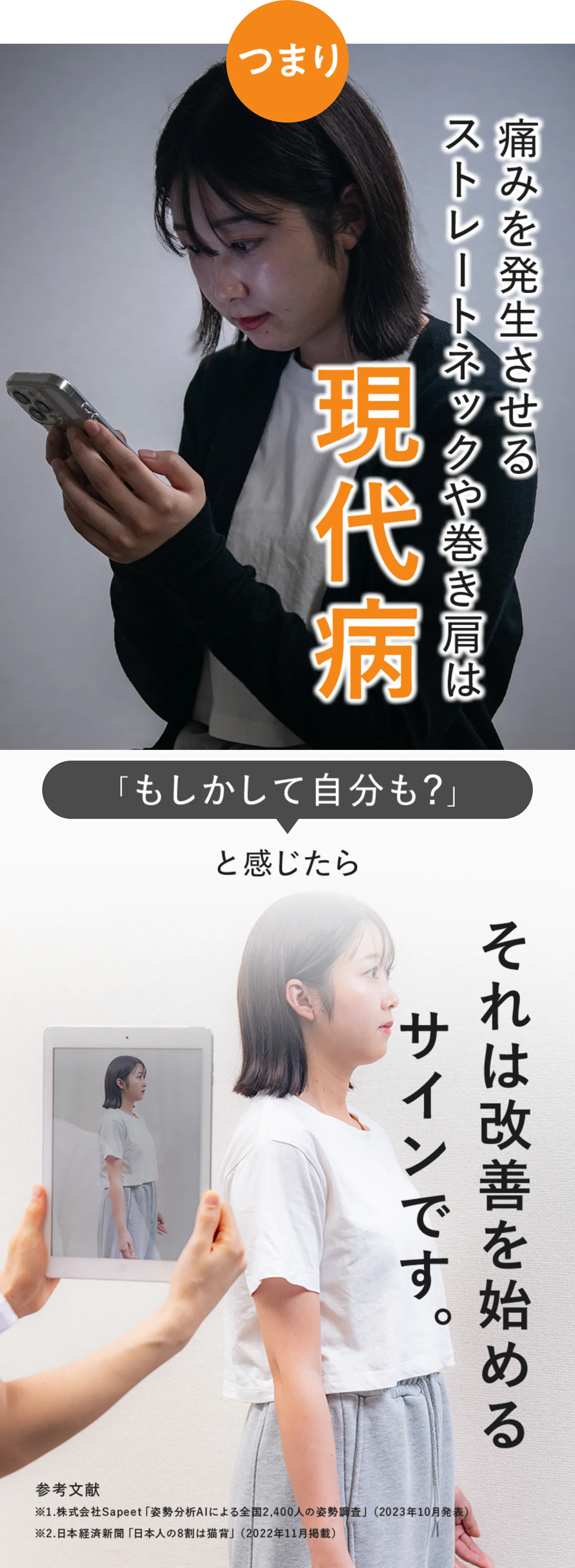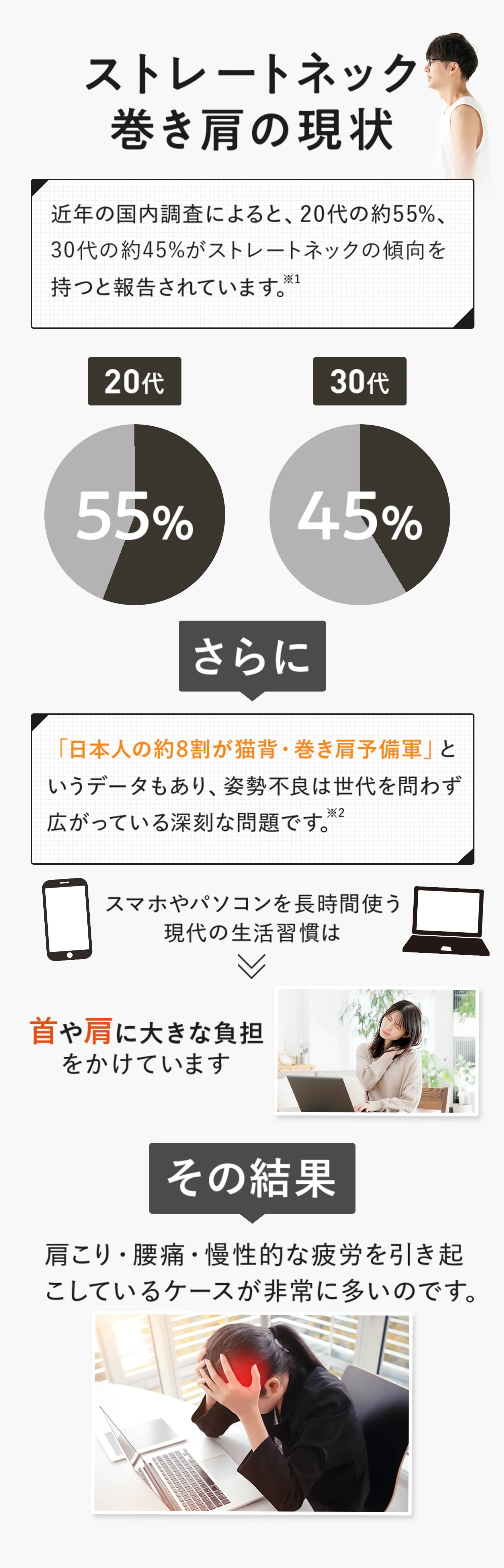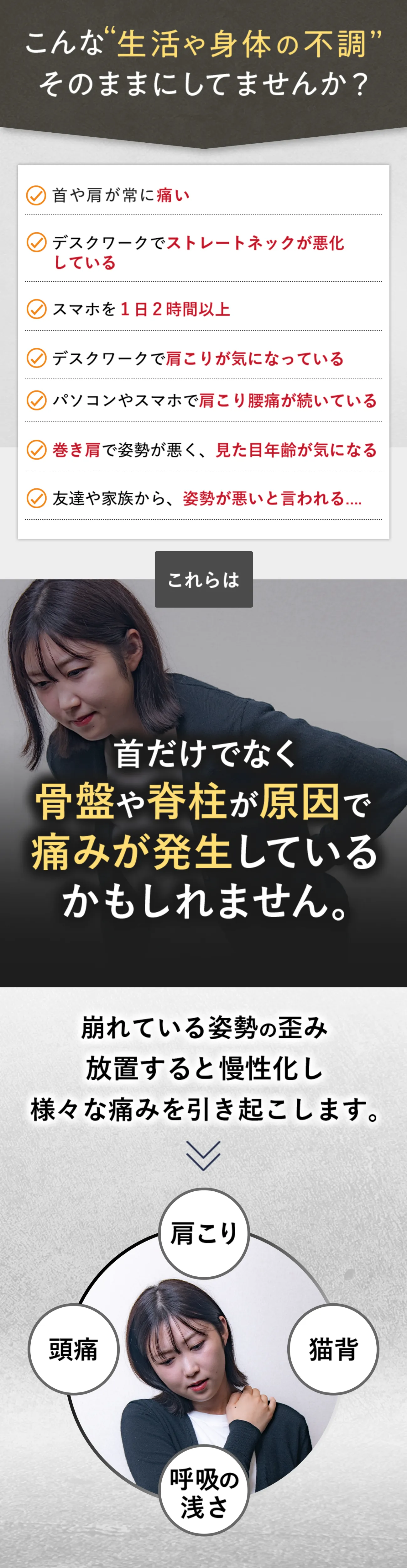 巻き肩やストレートネックの方の多くは、肩こりや腰痛を訴えています。