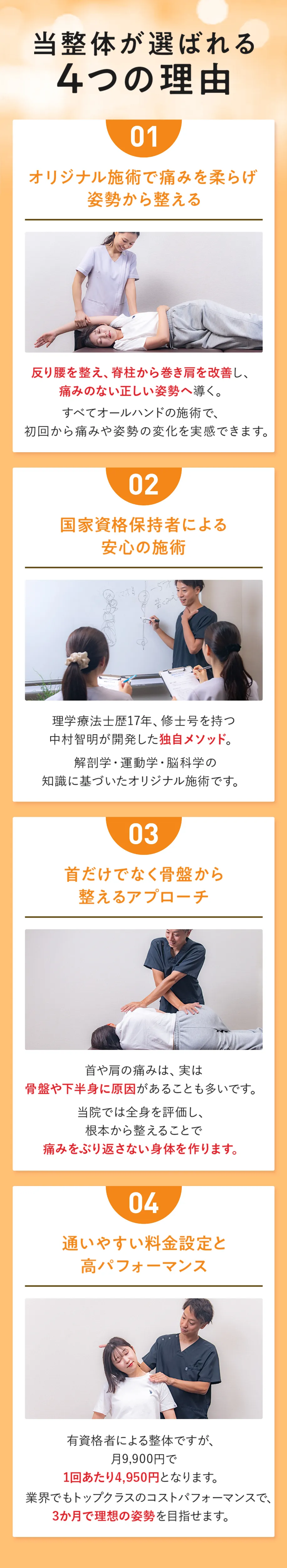 3か月で理想的な姿勢の定着を目指します。 その後は月1〜2回のメンテナンスで良い状態を維持できます。 -